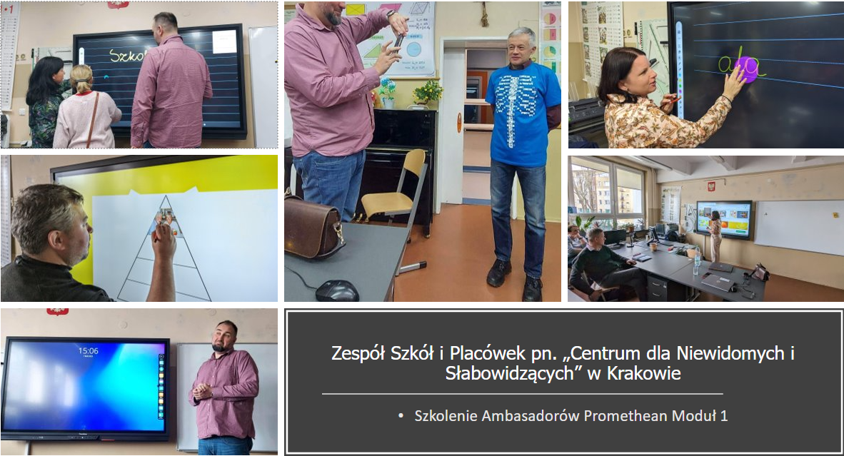 Na zaproszenie firm Interdesk dwoje naszych Ambasadorów odwiedziło Zespół Szkół i Placówek pn. „Centrum dla Niewidomych i Słabowidzących” w Krakowie. Przeprowadzili tam szkolenie z wykorzystania na lekcji monitorów Promethean. Moduł I szkolenia jest skierowany do nauczycieli którzy nie mają doświadczenia z technologią dotykową. Pozwoli ono każdemu zacząć pracę z monitorem Promethean zastępując nim zwykłą tablicę i dodając kilka funkcji interaktywnych. Jest to szkolenie które pozwoli „oswoić” nauczycieli i uczniów z nowym sprzętem i w naturalny sposób wprowadzić do codziennego użytku.